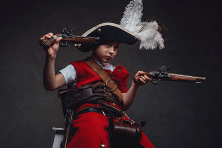 A man dressed as a pirate is aiming a gun in this photo, showcasing the characters action and costume.