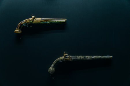 A set of old pistols on the shelf of a gift shop. Medieval weapons.