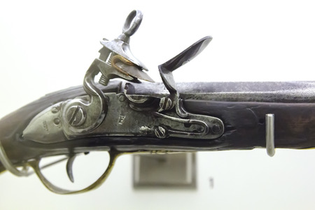 trigger of old-fashioned classic style rifle made of silver with ammunition on a white background