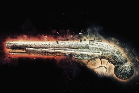 Vintage gun on the background of a burning fireplace. Selective focus.
