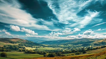 a serene landscape with a big sky filled with fluffy clouds, stretching over an open countryside with rolling hills.