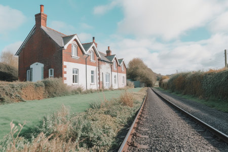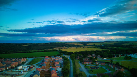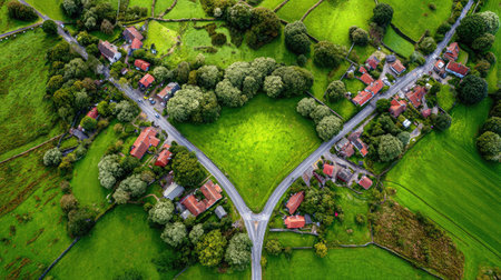 Aerial view of a cottage town amidst rolling hills, charming houses, idyllic countryside, peaceful surroundings, detailed and scenic depiction Generative AI