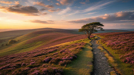Panoramic aerial view of a lone tree on a hillside in the Peak District National Park, UK