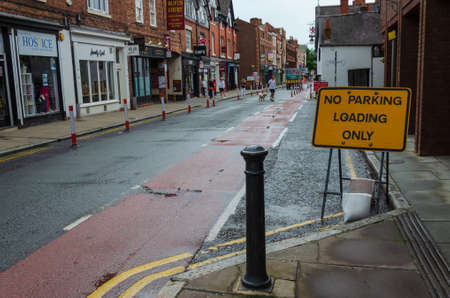Chester, UK: Jun 14, 2020: A general street scene of Chester City centre showing some traffic & pedestrian restrictions which have been put in place to allow social distancing due to Covid-19 pandemic