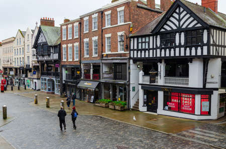 Chester; UK: Jan 29, 2021: A general view in the historic city centre of Chester on a Friday afternoon, reveals that very few people are out shopping during the corona virus pandemic.