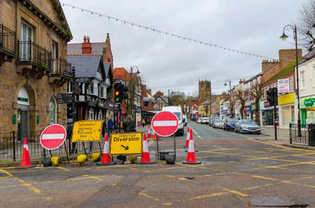 Mold, Flintshire; UK: Jan 28, 2021: A very quiet Mold town centre on a Thursday afternoon. Traffic restrictions and lane closures have been put in place to enable social distancing for pedestrians