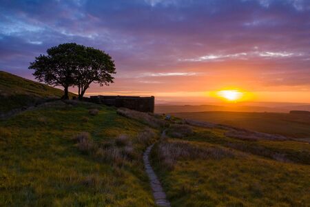 An aerial Sunrise drone shot of Top Withens or Top Withins, this farmhouse has been associated with