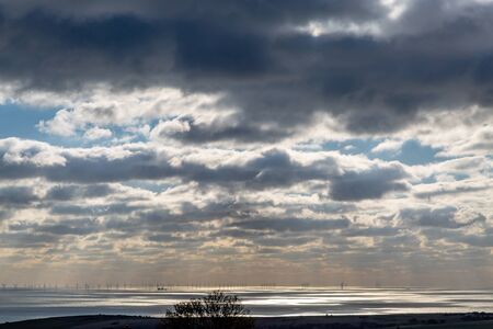 Sunlight shining through clouds onto the sea, with an off shore wind farm on the horizon