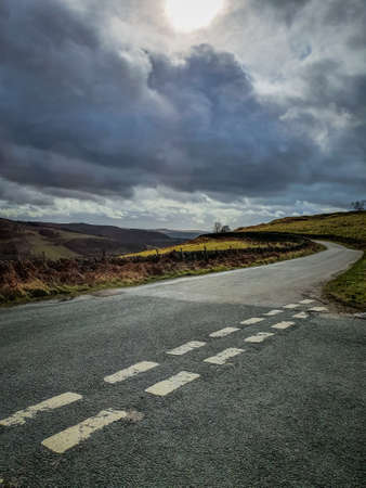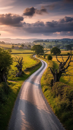 Sky showing winding gravel road through a lush green countryside with rolling hills dramatic clouds and silhouetted trees at sunset keywords: winding road, gravel...