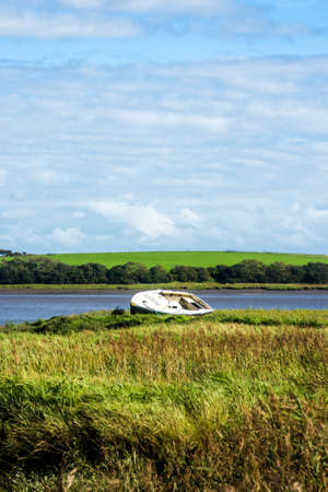 A lonely boat aground on the River Wyre estuary in Lancashire, UK.