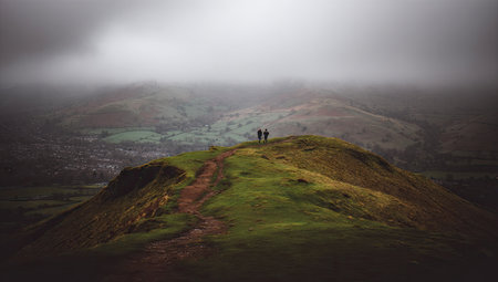 High-angle view of a grassy hilltop with two figures standing on the crest. A valley and distant towns are visible in the mist. A well-worn path leads to the top.
