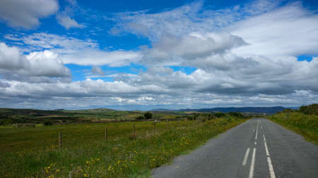Country road winding through a rural landscape with stone dry walls and an old cottage