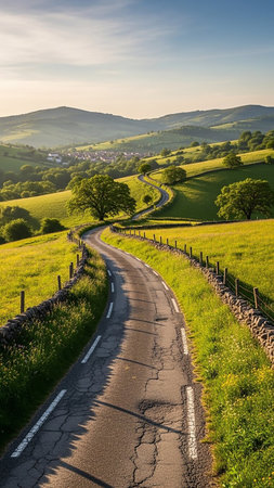 Stock showing a picturesque winding road with a stone wall border traversing vibrant green rolling hills under a clear blue sky, dotted with trees and a small...