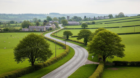 Farmland showing winding country road through lush green rolling hills and pastoral farmland with sheep and village in the distance keywords: country road, winding,...