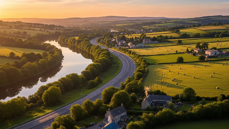 A winding asphalt road curves alongside a reflective river through vibrant green rolling hills and cultivated fields under a warm golden sunset sky.