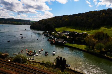 Fisherman boat harbour village in Wales, UK, england cloudy sky and green hills