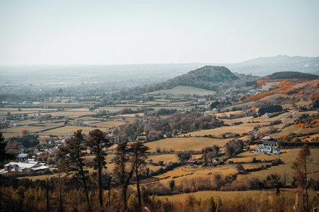 Looking across the english countryside on a winters sunrise, with mist lying in the valley below. From Raggedstone Hill on the Malvern Hills looking across to May Hill. UK.
