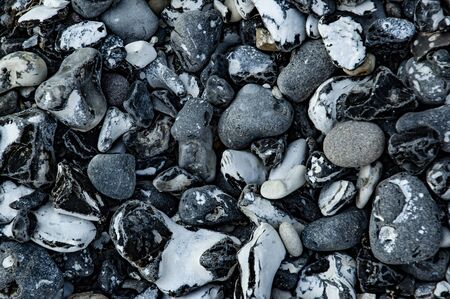 Black pebbles background texture. Close up grunge black sea stone, black and white style.