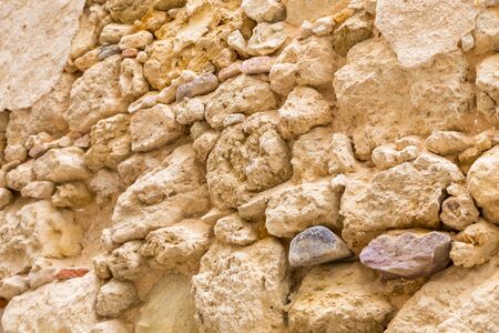 wall lined with variegated sea pebbles, background texture of gray-beige shades
