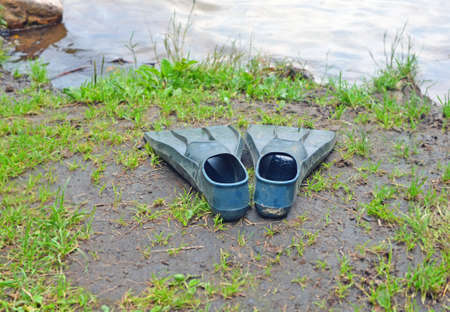 Blue wet flippers for swimming on wild shore of lake in rain. Selective focus on fins.