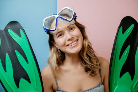Pretty young woman in diving mask against pink background. Summer concept