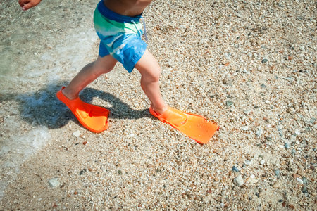 Foot of a little boy wearing blue flippers for learn to swim standing on the beach sand. Summer vacation holiday relax ,Sport activities for children having fun at outdoors.