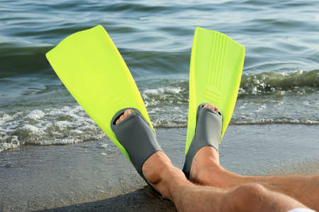 Human feet in swimming equipment flippers fins on beach sea shore. Summer vacation fun concept.