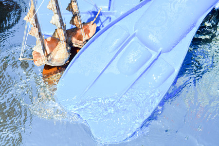 Toy ships and flippers reflected in pure water, nature