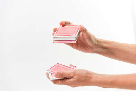 Close-up shot of isolates of male hands holding a lot of stacked 35mm film, obtained by taking pictures with old cameras which were popular in the old days.