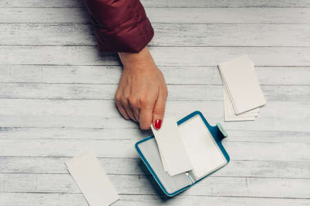 A hand dressed in formal attire is actively putting colorful postcards into a dark box, showcasing an artistic blend of travel and memories in a modern context.