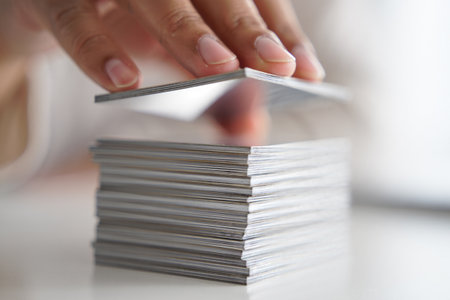 top view of the hands of a woman making a selection of pictures on a selection process of images on a desk after a photoshoot - focus on the center of the image