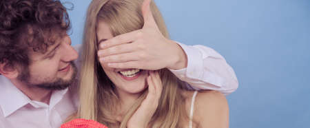 Playful man guy covering woman girl eyes. Happy smiling couple having fun together. Surprise.
