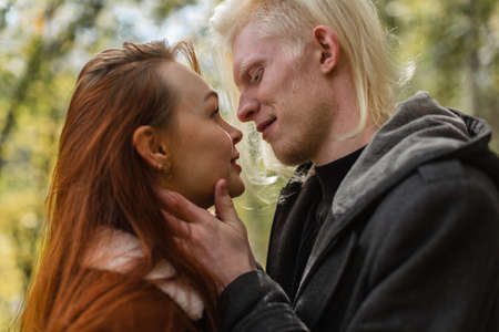 A smiling albino man in a black hoodie looks into the eyes of his beloved red-haired girl in an orange jacket, holding her chin against a background of foliage. shooting in profile