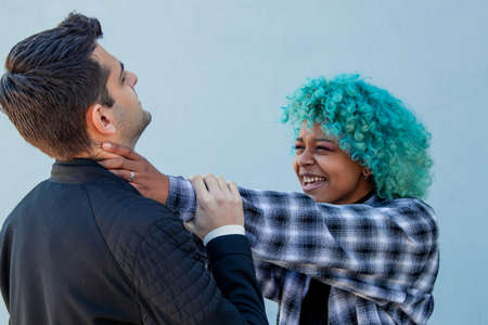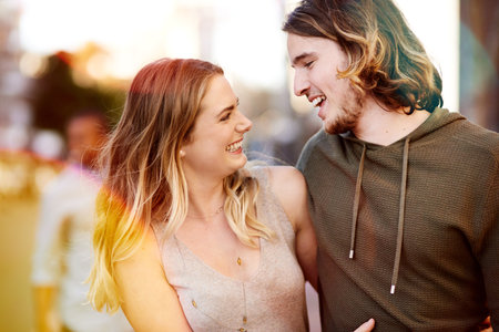 Funny couple laughing with a white perfect smile and looking each other outdoors with unfocused background