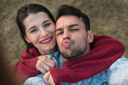 Romantic fashion traveling couple making self-portrait on park background. Caucasian handsome man and beautiful woman embracing together at date day, blowing kiss on nature backgroud.Lifestyle concept