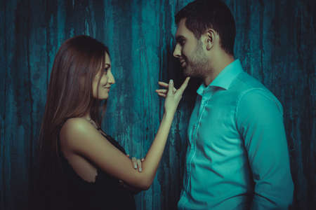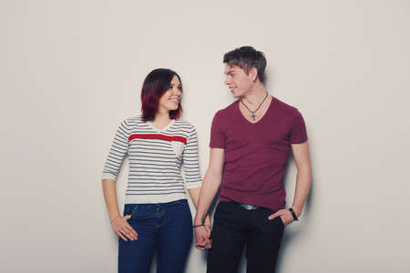 Cheerful couple in casual wear looking at each other, standing near concentrate wall