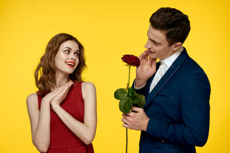 Lovers men woman with red rose in hands romance holidays yellow background family friends.