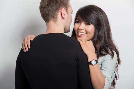 Interracial couple, romance and together for portrait, love or anniversary. Background, hug and