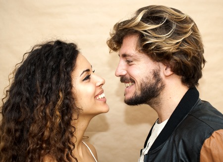 Couple flirting. Romantic kiss. Trust and support. Cute and sweet relationship is dream for every girl in world. Couple in love. Couple goals concept. Man and woman beige background. Family love