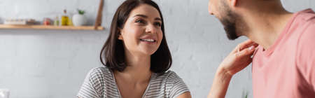 smiling young woman touching shoulder of boyfriend in kitchen, banner