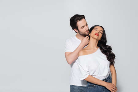 young man touching neck of passionate woman with closed eyes isolated on grey