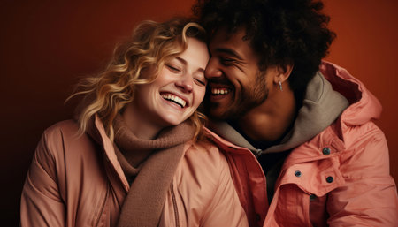 Young loving gay couple share a playful exchange filled with laughter and warmth against a textured backdrop.