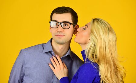 Smart husband. Happy couple. Couple in love. Family couple hugging on yellow background. Caucasian man and sexy woman cuddling. Sensual couple together. Family day. Careful hug of loving people