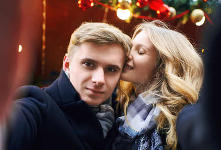 elegant romantic couple in love making selfie, kissing and posing on festive decorations background. Spending time together in the city, having a date. urban romantic portrait. Romantic, love and Valentine's Day concept.
