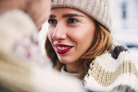 Smiling pretty female is embracing beloved man with woolen scarf as they are walking on winter day
