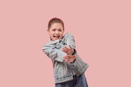 A frightened beautiful girl put her hands forward. The child is protected from violence. Pink background.