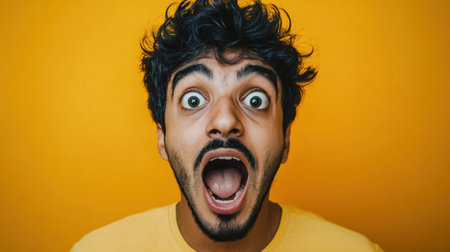 Close-up portrait of a man with a shocked expression against a yellow background. His eyes are wide, and his mouth is open in surprise.