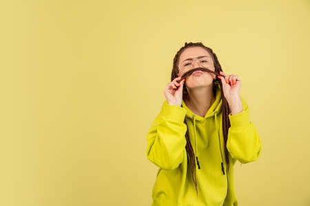 Caucasian young womans portrait isolated over yellow studio background with copyspace