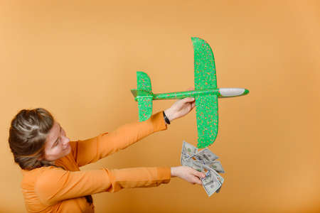 Girl holding airplane and money in her hands, concept of vacation and travel.