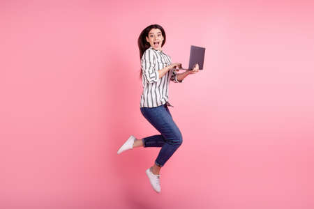 Full body profile side photo of excited girl jump use laptop agent manager isolated over pink color background